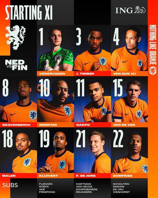 本场比赛,荷兰队主教练派出了4231的阵型。门将位置上,费布吕亨将镇守球门。后防线上,邓弗里斯、廷伯、范戴克和范德芬将联袂出战,为球队筑起一道坚固的防线。其中,廷伯和范戴克作为后防核心,将肩负起阻止芬兰队进攻的重任。