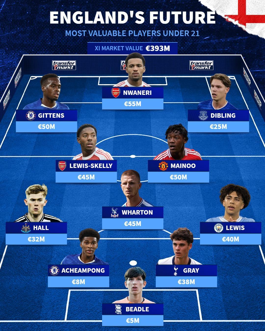 北京时间10月12日,德国转会市场(德转)更新了英格兰U21国家队身价最贵阵容名单。在这份星光熠熠的榜单中,阿森纳小将恩瓦内里以5500万欧元身价成为最贵球员,曼联新星梅努、切尔西前锋比诺埃-吉滕斯等天才球员也悉数入选。