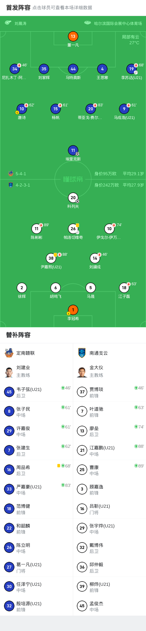 北京时间10月12日,中甲联赛第26轮迎来一场焦点对决,定南赣联坐镇主场迎战南通支云。经过90分钟激战,双方以1-1握手言和。本场比赛,埃里克斯与科列夫分别建功,成为决定比赛走向的关键人物。