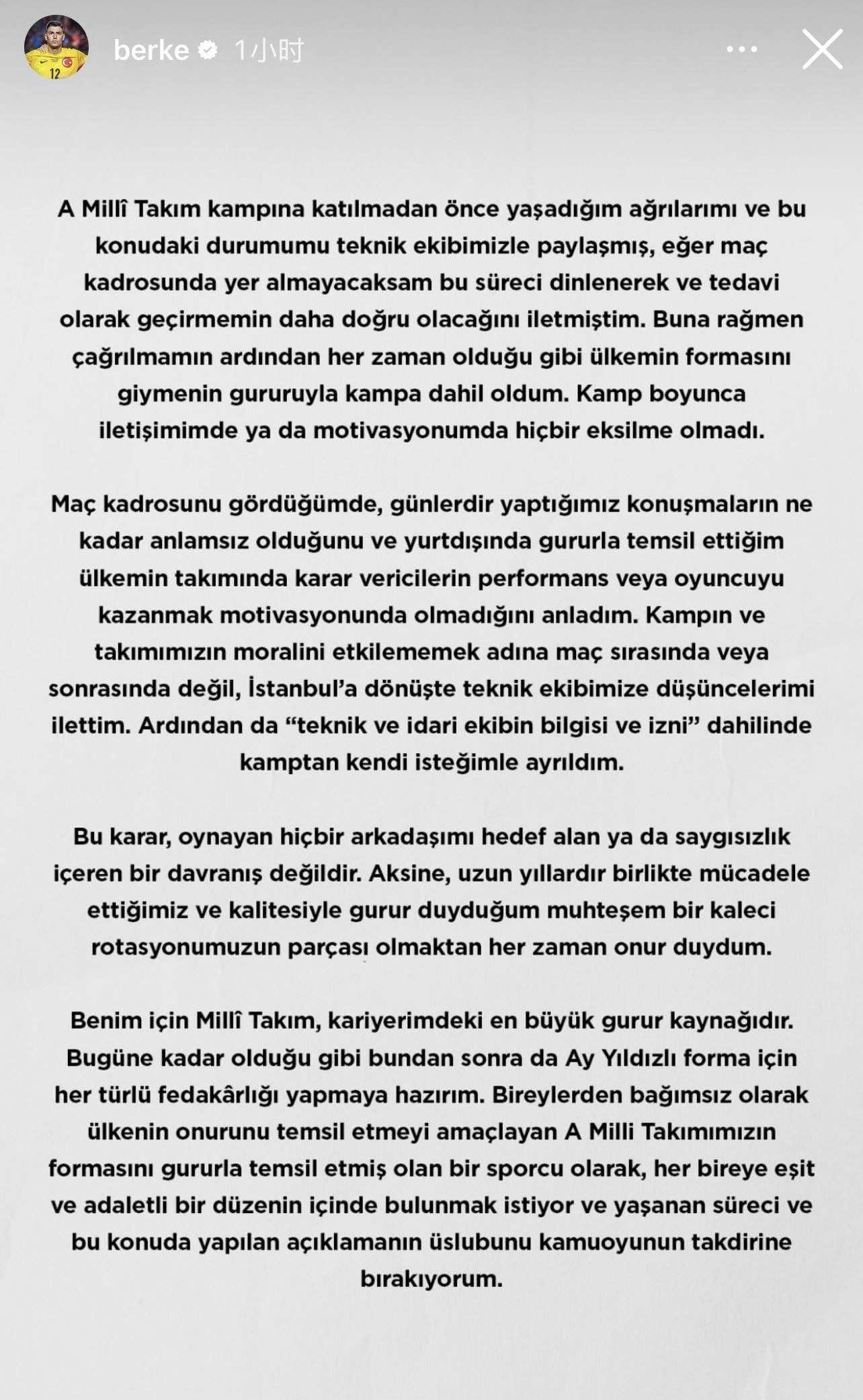对我来说,国家队是我职业生涯中最大的荣耀。今后,我依然愿意像以往一样,为了土耳其的球衣付出一切牺牲。作为一个一直以代表祖国荣誉为目标的球员,我希望能处在一个对每个人都公平公正的环境中。对于这次的过程以及相关声明的语气,我将交由公众自行评判。