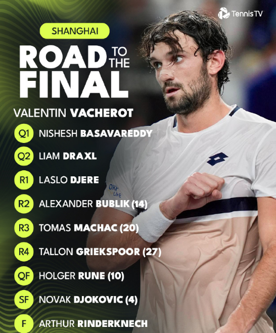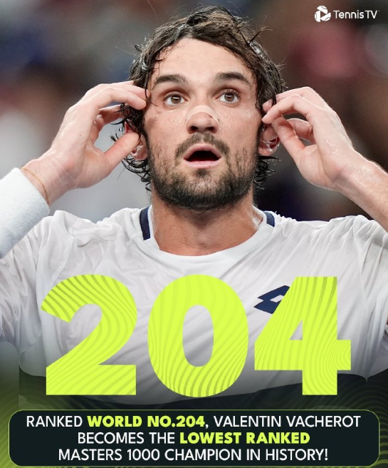 瓦舍罗以世界第204名夺得上海大师赛男单冠军,创造大师赛历史单打最低排名夺冠纪录。此前纪录是2022年世界第152名的丘里奇,夺得辛辛那提大师赛男单冠军。