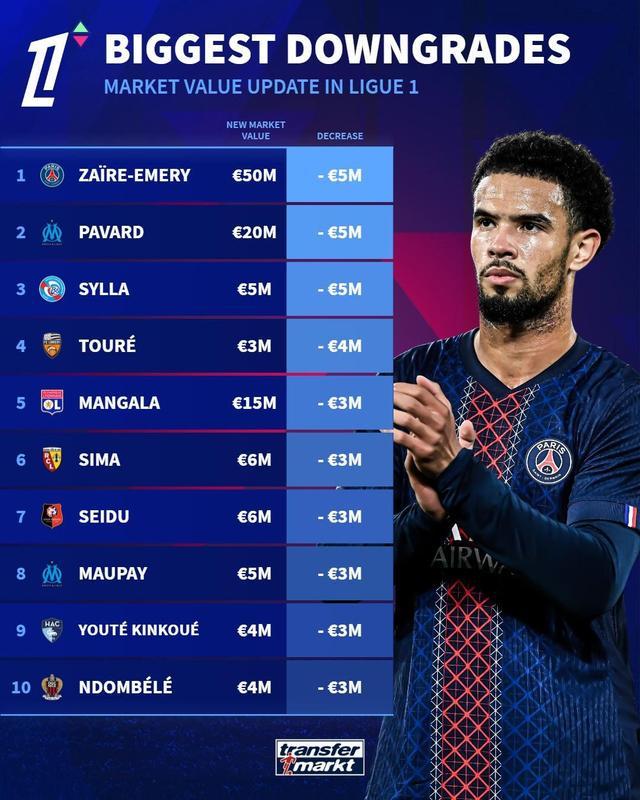 - 扎伊尔-埃梅里(巴黎圣日耳曼):原身价5500万欧,现身价5000万欧,跌幅500万欧
