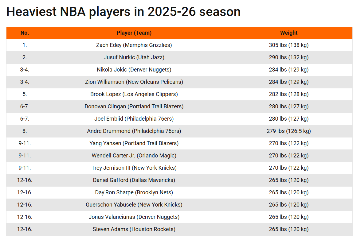 榜单显示,爵士队中锋努尔基奇以132公斤紧随其后,位列第二。而备受关注的鹈鹕队球星锡安与掘金队核心约基奇则均以129公斤并列第三,展现了他们在力量对抗方面的优势。此外,快船队的大洛佩兹、开拓者队的克林根、76人队的恩比德以及活塞队的德拉蒙德等内线球员,也分别以不同的体重位列第4至第8位。