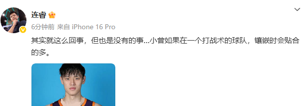 针对这一情况,媒体人连睿发表了自己的看法。他表示,虽然曾凡博在当前的球队环境中表现受到一定限制,但如果他能够在一个更加注重战术体系、打法更为明确的球队中效力,那么他的个人能力和特点将能够得到更加充分的发挥和体现。连睿用“镶嵌时会贴合的多”来形容曾凡博在战术体系完善球队中的适配度,意味着他相信曾凡博在这样的环境中能够更好地融入球队,为球队贡献自己的力量。