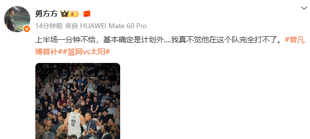 针对曾凡博上半场未能登场的情况,北京知名媒体人“勇方方”发表了自己的看法。他指出,上半场一分钟的出场时间都未给予曾凡博,这基本上可以确定他在本场比赛的计划之外。然而,他同时强调,这并不意味着曾凡博在篮网队就完全没有出场的机会。