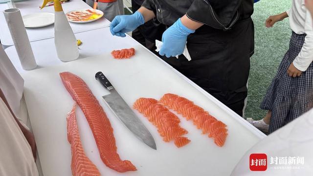 下午五点半,成都双流体育中心“嘉年华”现场早已人声鼎沸。展示台前,里三层外三层围满了好奇的球迷和市民。展台中央,一条长约80厘米的挪威三文鱼冰雕般静卧于碎冰之上,银灰色的鱼皮泛着冷冽光泽,饱满的体型引得观众阵阵惊叹。身着专业制服的开鱼师手持长刀登场,刀锋精准切入鱼腹,银光闪烁间,动作行云流水。每一次下刀都干净利落,鱼皮剥离、鱼骨分离,整个过程如同一场惊艳绝伦的表演。当橙白相间的完美鱼腩被完整取下时,人群中爆发出阵阵“哇”声。