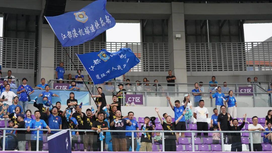 现场那一片远征的蓝,是球队最坚实的后盾。江都华伦老石、港机、风云等球迷协会的成员们,用震天的战鼓与不变的战歌,点燃仪征中学体育场。“战斗,江都队!”“进一个!进一个!”的呐喊声贯穿始终。比赛结束后,全体江都队员第一时间跑到客队看台下,与这些最可爱的球迷们隔空击掌、鞠躬,共同分享胜利的喜悦。