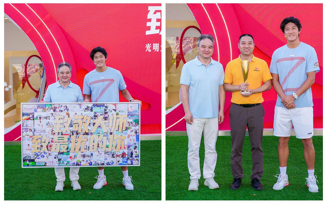 活动现场,张之臻动情回忆这段特殊情谊:“我从小喝光明牛奶长大,2023年开始以‘鲜活大使’身份和光明并肩,亲眼看到品牌对网球事业的支持越来越深入,特别自豪。”为致敬这段跨界携手,黄黎明为其送上精心定制的“时光回顾照片框”,收录双方合作以来的珍贵瞬间;张之臻则回赠2025大师杯签名相框,让这份“双向奔赴”的品牌佳话再添温暖注脚。