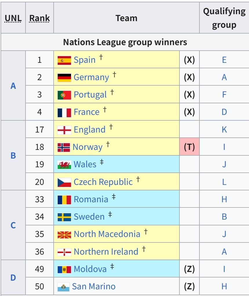这种看似矛盾的逻辑,实则源于欧足联复杂的附加赛规则。除小组第二直接晋级外,还存在一条“外卡通道”:根据2024–25赛季欧国联临时总排名,未获得世预赛小组前两名的国家联赛小组头名球队中,排名最高的四支将获得附加赛资格。若符合条件的球队不足四支,剩余名额将按欧国联排名顺延分配。