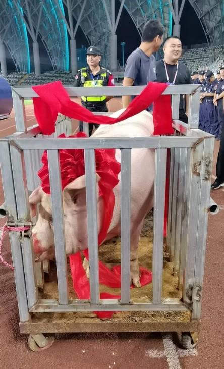 在颁奖仪式期间,这头400斤重的猪被赛事工作人员用推车缓缓推到了场地中央,成为了全场瞩目的焦点。当冠军队球员们合影留念时,这头猪也格外“抢眼”,为这张珍贵的合影增添了不少欢乐气氛。