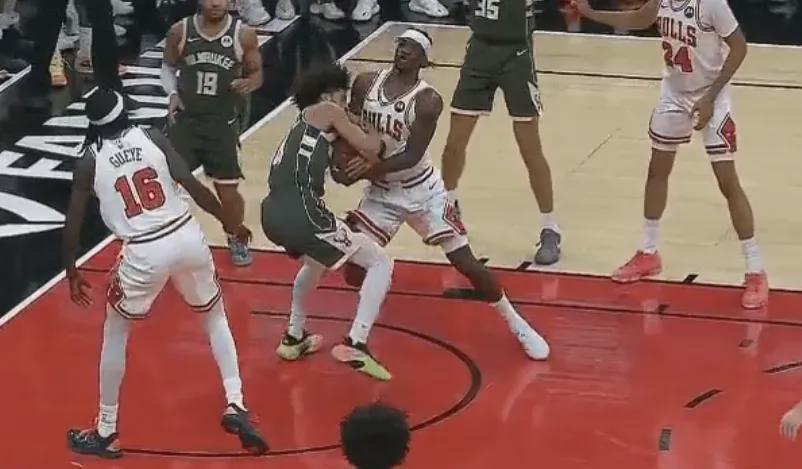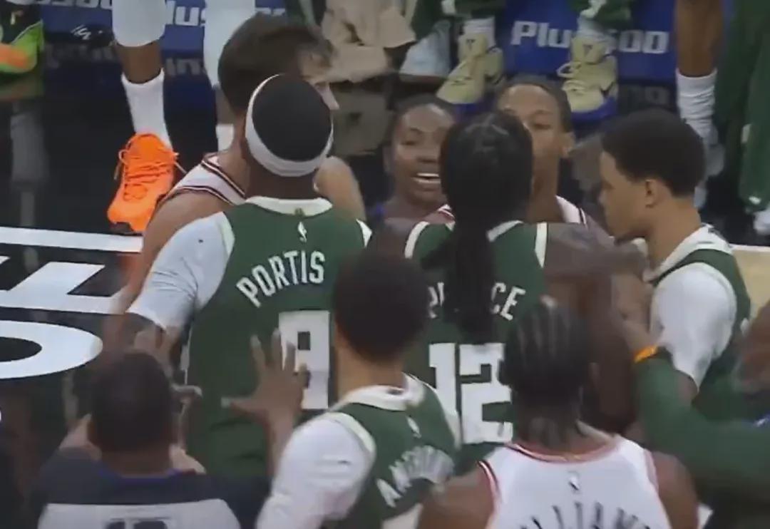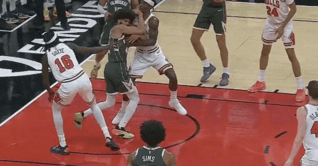 到了第三节比赛即将结束时,雄鹿和公牛的球员终于爆发了冲突。公牛的特里持球突破,却遭到了波蒂斯和普林斯的包夹防守。波蒂斯一把将特里的球盖掉,随后普林斯又紧紧抱住了特里。特里显然对此非常不满,直接对着普林斯发起了攻击。