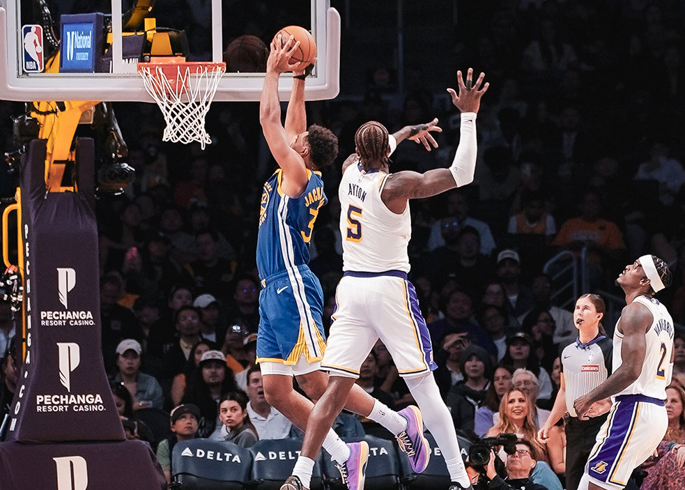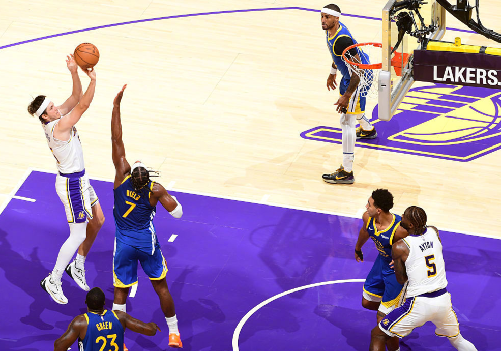 赛前,勇士队再度遭遇坏消息,穆迪因小腿伤势,直接无缘剩下的季前赛,不过乐观预估可以赶上常规赛揭幕战。而科尔教练则一口气轮休了库里、巴特勒和霍福德,只剩下库明加和追梦格林带队。勇士队的首发阵容为:波杰姆斯基、希尔德、库明加、格林和波斯特;湖人队的首发阵容则是:里夫斯、克内克特、范德比尔特、八村塁和艾顿。比赛开始后,里夫斯撤步中距离和撤步三分突然爆发,波杰姆斯基和库明加则轮流单打,波斯特和八村塁对轰三分球。两队胶着了几分钟后,八村塁三分命中,艾顿补篮得手,打破了场上的平衡。虽然波杰姆斯基手感火热,但勇士队丢了太多篮板球。