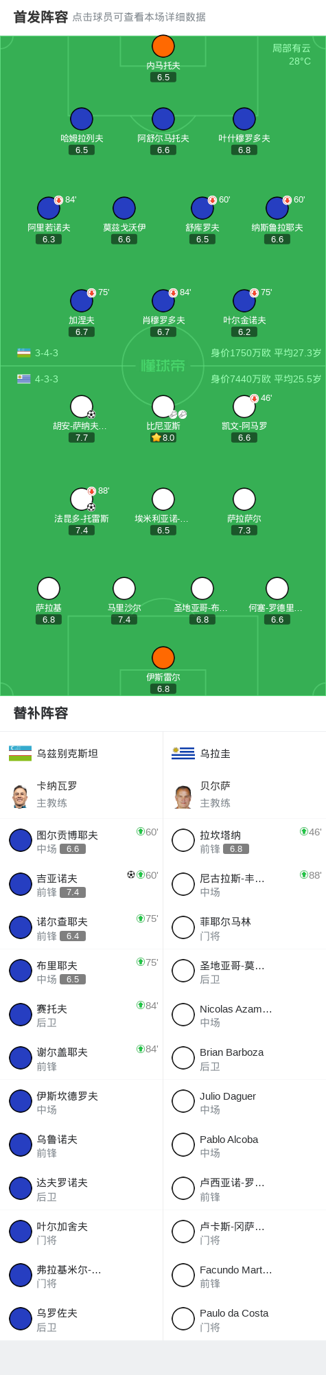 在一场备受瞩目的国际友谊赛中,乌兹别克斯坦国家队与南美劲旅乌拉圭队展开了一场激烈的对决。比赛过程中,乌拉圭队凭借出色的进攻组织和精准的传球,最终以2-1的比分战胜了乌兹别克斯坦队。