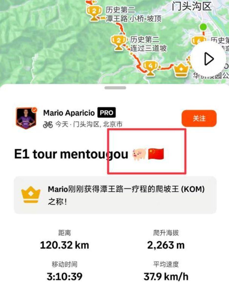 涉事车手名为马里奥-阿帕里西奥(Mario Aparicio),是跟随车队来到中国北京参加环门头沟国际公路自行车赛的。在完成比赛后,阿帕里西奥在社交媒体上分享了自己的参赛成绩,但同时发布的图片中却包含了五星红旗与猪头符号的组合,并附上了“E1 tour mentougou(门头沟自行车赛)”的文字说明。