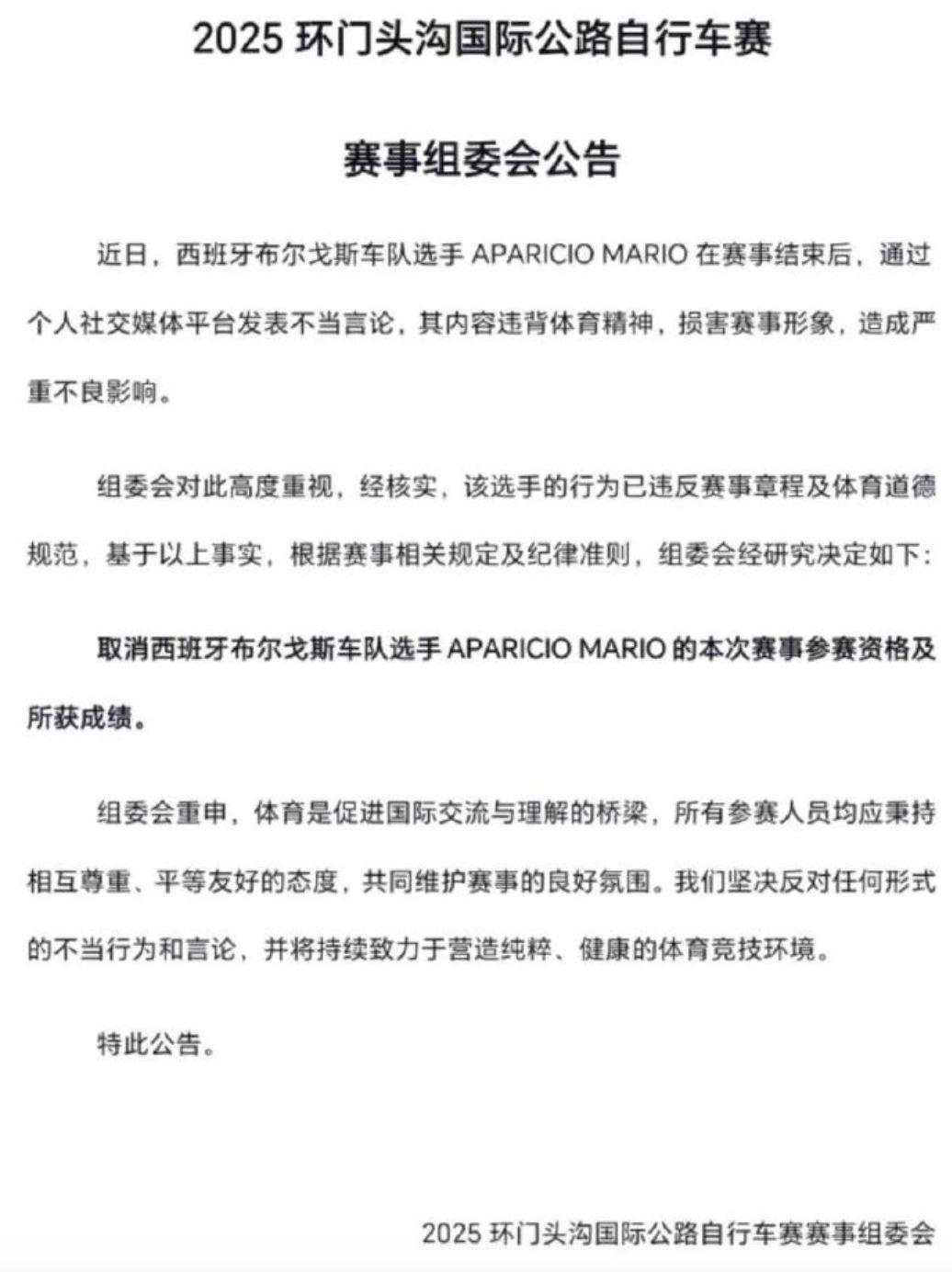 面对网友的强烈反应,10月13日,赛事主办方发布公告,明确指出阿帕里西奥的行为构成了不当言论,严重违反了体育精神,损害了赛事的形象,并造成了极其恶劣的影响。根据赛事规定,组委会决定取消阿帕里西奥在本次赛事中的所有成绩。