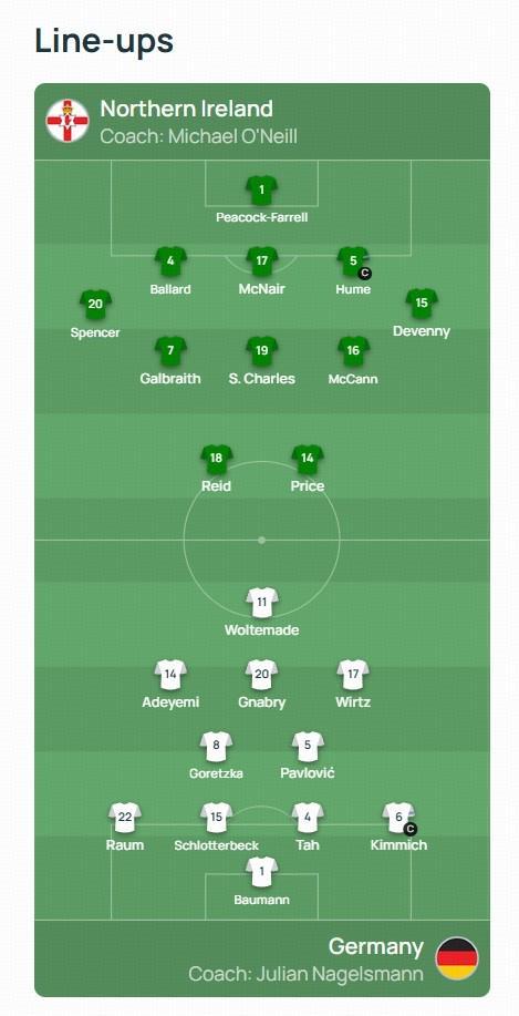 德国队此役派出了强大的首发阵容,门将位置由1号鲍曼把守。后防线上,6号基米希、4号约纳坦-塔、15号施洛特贝克和22号劳姆组成了坚固的防线。中场方面,8号格雷茨卡和5号帕夫洛维奇搭档双后腰,为球队提供稳定的控球和防守。进攻端,20号格纳布里、17号维尔茨、14号阿德耶米和11号沃尔特马德联袂出战,其中沃尔特马德与维尔茨的搭档尤为引人注目。