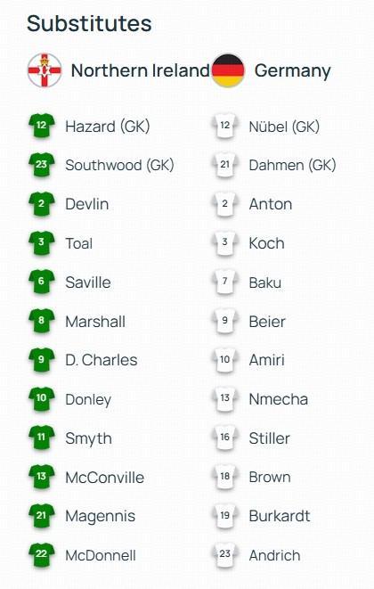 北爱尔兰队的替补席上,也有12号哈泽德、23号索思伍德、2号德夫林、3号托尔、6号萨维尔、8号马歇尔、9号查尔斯、10号唐利、11号保罗-史密斯、13号麦康维尔、21号莫根尼斯和22号杰米-麦克唐奈等球员,他们同样具备改变比赛的能力。