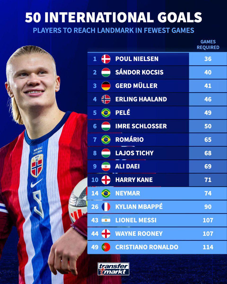 北京时间10月13日,德国转会市场(德转)发布了最新一期国家队最快打入50球的球员榜单,引发全球球迷热议。这份榜单汇聚了足坛历史上最具进攻效率的传奇射手,其中丹麦传奇前锋波尔·尼尔森以36场创下历史最快纪录,而现役球星哈兰德、凯恩等巨星也成功跻身前十。