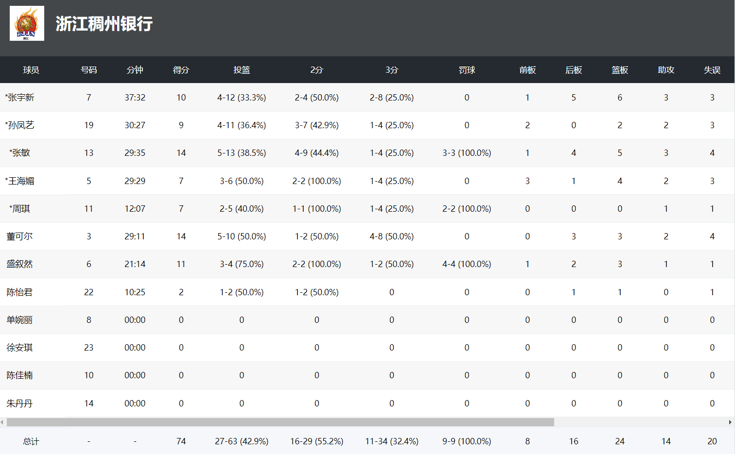 相比之下,浙江女篮虽然也有4人得分上双,但整体实力仍显不足。张敏与董可尔均拿到14分,成为浙江队的最高得分者;张宇新则贡献3次助攻,为球队组织进攻。然而,在李梦的强势表现面前,浙江女篮还是显得力不从心。