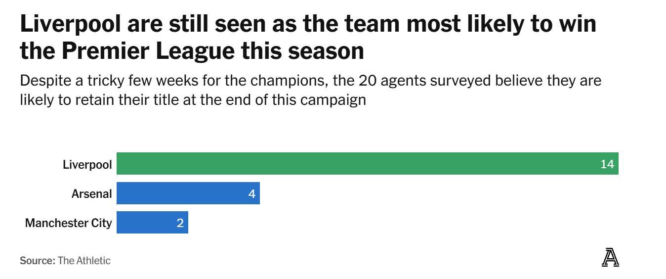 当被问及本赛季英超前四名球队时,一位经纪人表示:“阿森纳确实有所进步,但我仍然不确定他们是否足够好。”然而,超过三分之二(14位)的经纪人预测利物浦将卫冕冠军,尽管他们在国际比赛日之前的表现有所波动。