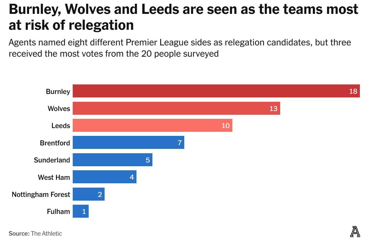 这也反映出狼队的负面情况,他们获得了第二高的降级票数(13票),仅次于伯恩利(18票)。一位经纪人说:“狼队现在太软弱了,而且他们失去了关键球员。那是一支会挣扎求存的阵容。”