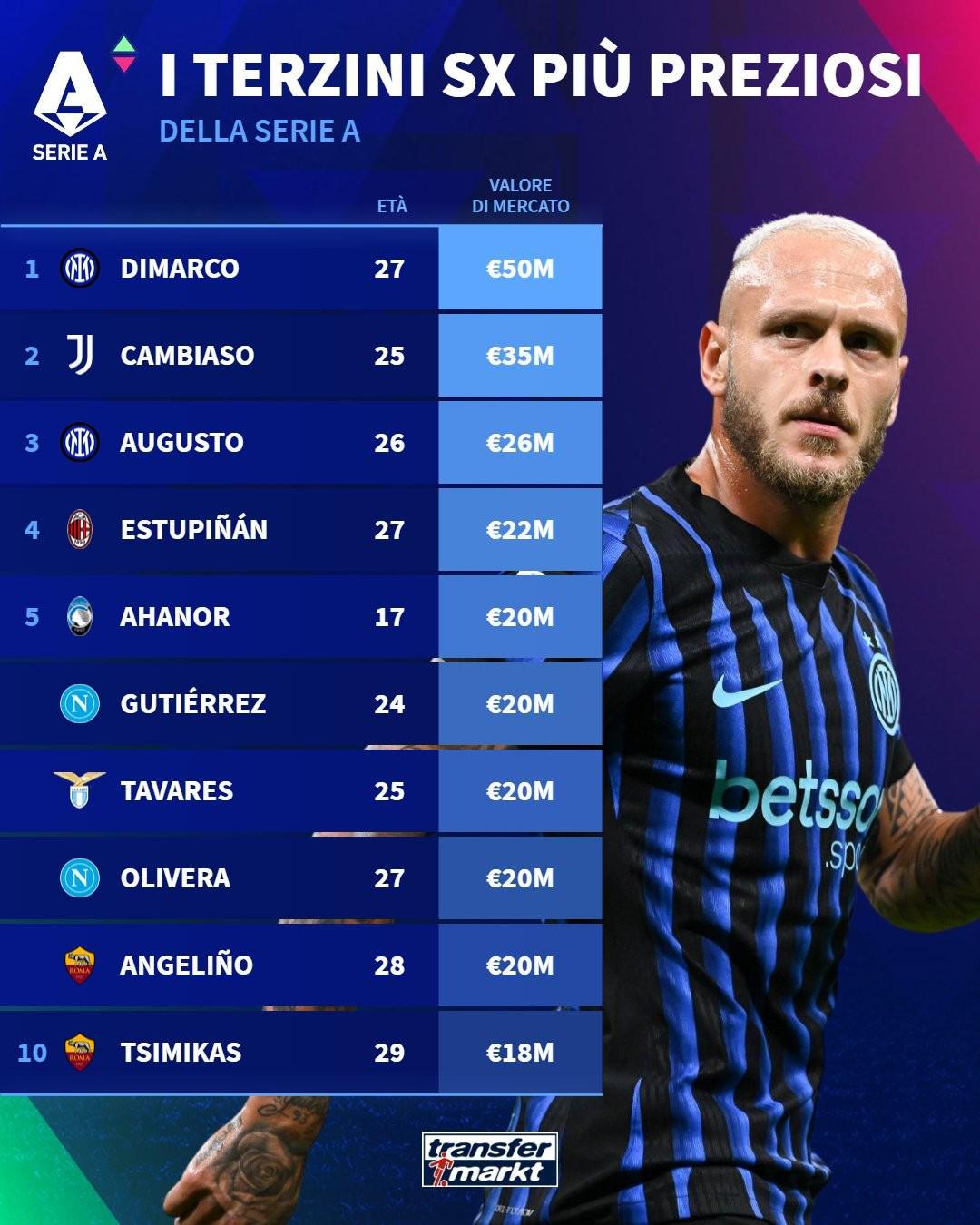 - 1. 费德里科·迪马尔科(国际米兰) - 5000万欧元