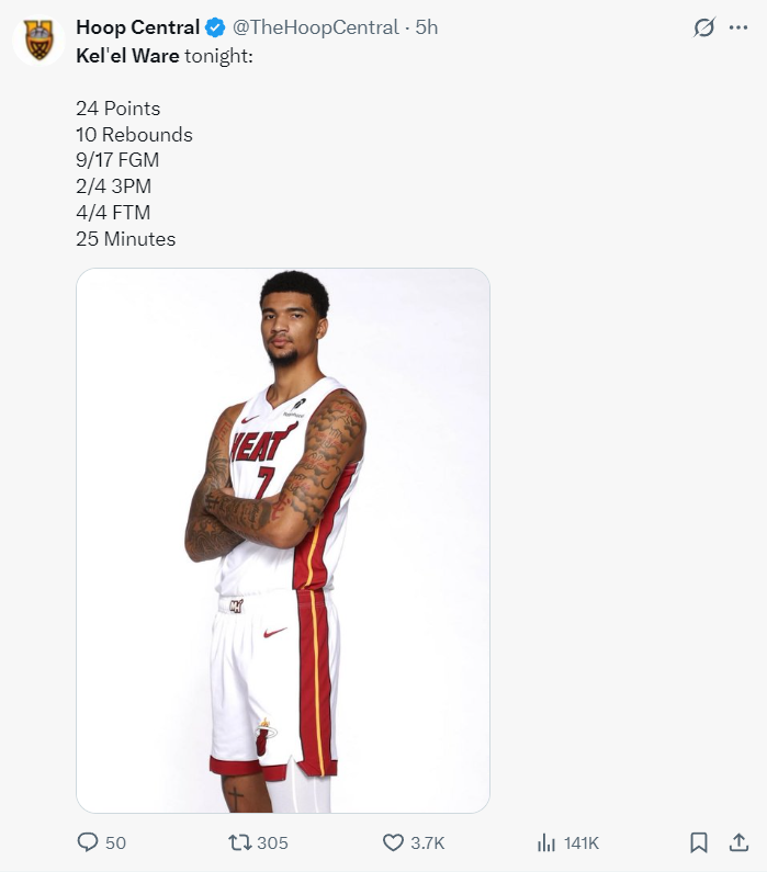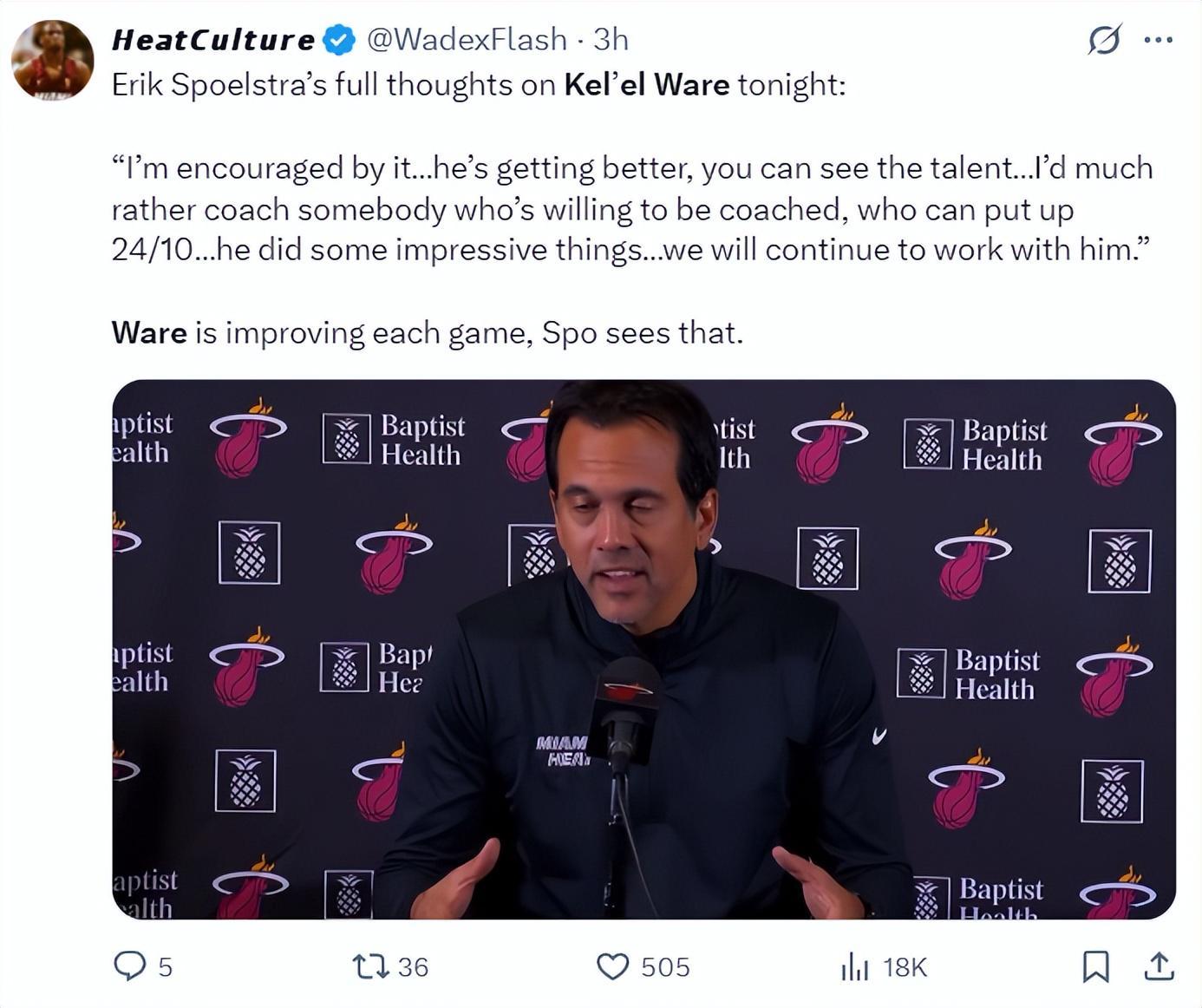 赛后,热火主教练斯波对韦尔的表现赞不绝口:“他的表现让我备受鼓舞,他正在不断进步,他的天赋肉眼可见。我更乐意执教那些愿意进步、在场上全力以赴的球员。韦尔在场上打出了令人印象深刻的回合,我们会跟他一同努力,共同成长。”