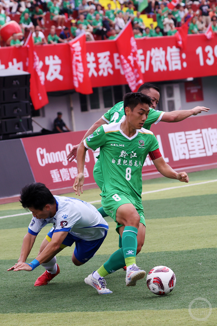 下半场易边再战,黔江白垩纪恐龙队加强了攻势,试图打破僵局。不久后,他们便赢得了一次宝贵的点球机会,全场球迷屏息以待。然而,武隆乐源队的门将表现出色,成功将点球扑出,化解了这次危机。随后,双方继续展开拉锯战,但均未能再改写比分。最终,经过90分钟的激烈角逐,黔江白垩纪恐龙队与武隆乐源队以0∶0的比分握手言和,平分秋色。