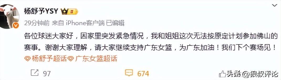 北京时间10月14日,广东女篮球员杨舒予在社交媒体上发布声明:各位球迷大家好,因家中突发紧急情况,我和姐姐杨力维无法按原计划参加佛山的赛事。感谢大家的理解,请继续支持广东女篮,为广东加油!我们下个赛场见。