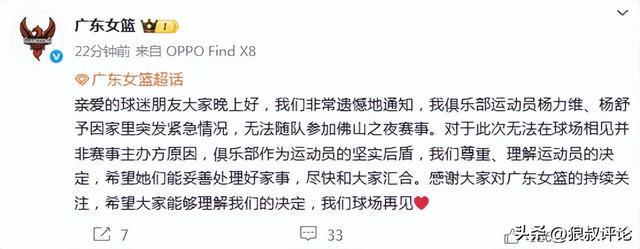 广东女篮官方社交媒体随后回应称:我们非常遗憾地通知,我俱乐部运动员杨力维和杨舒予因家中突发紧急情况,无法随队参加佛山之夜赛事。此次未能与球迷在球场相见并非赛事主办方原因,俱乐部作为运动员的坚实后盾,尊重并理解运动员的决定,希望她们能妥善处理好家事,尽快回归。感谢大家对广东女篮的持续关注,希望大家能够理解,我们球场再见。
