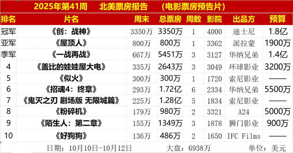 2025年第41周,10月10日至12日,北美迎来“哥伦布日”小档期,所以来了一部相对较为重磅的新片,但总体冷淡趋势未能扭转。