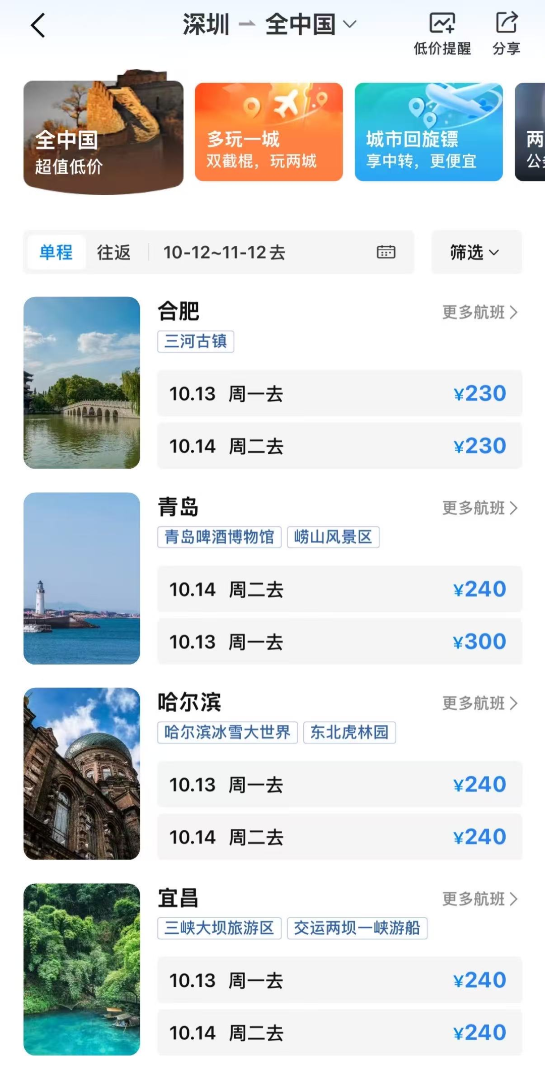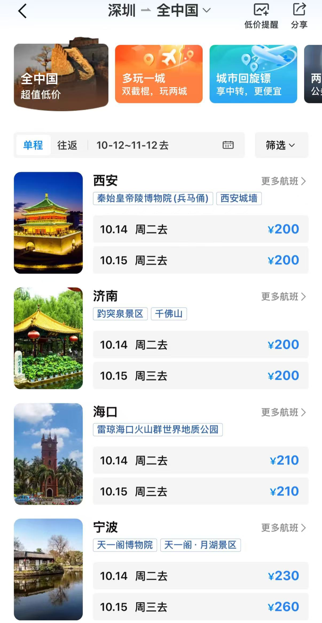 小编通过查询发现,节后从深圳出发至西安、济南等热门城市的单程机票价格竟然低至200元!这样的价格,简直让人难以置信。