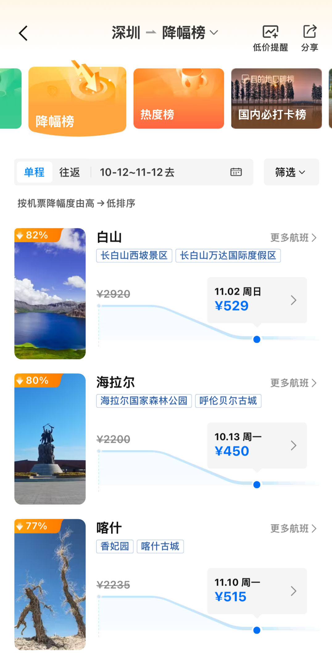 更令人震惊的是,深圳飞往多地的机票价格降幅竟然达到了80%以上!比如11月2日,深圳飞往白山的单程价格竟然跌至529元,降幅高达82%!这样的价格,简直让人心动不已。