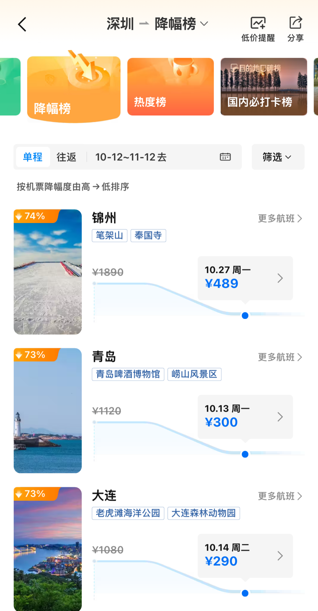 此外,深圳飞往锦州、青岛的机票价格降幅也均达到了70%以上。而深圳飞往天津、舟山、北京等地的票价降幅也达到了70%左右。这样的价格,对于想要出游的人来说,无疑是一个巨大的福音。
