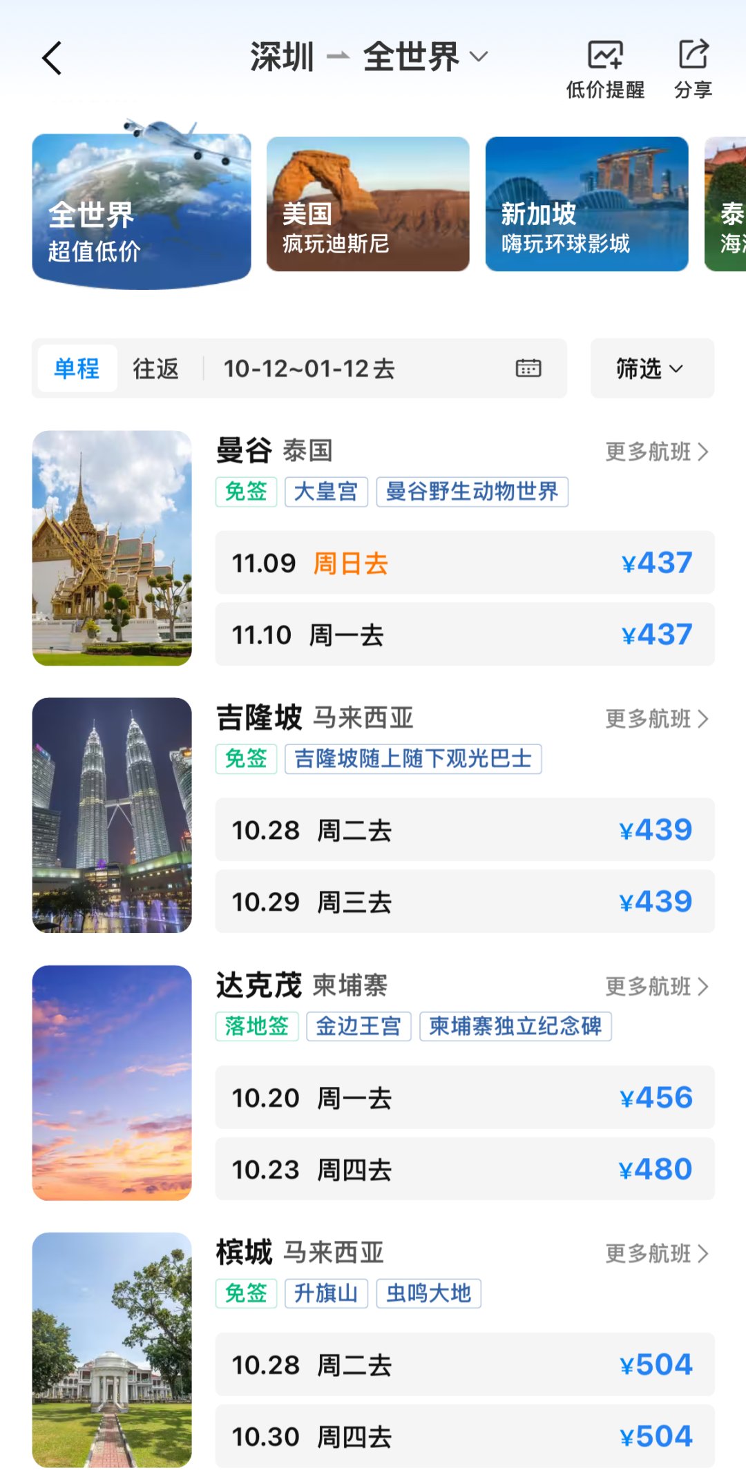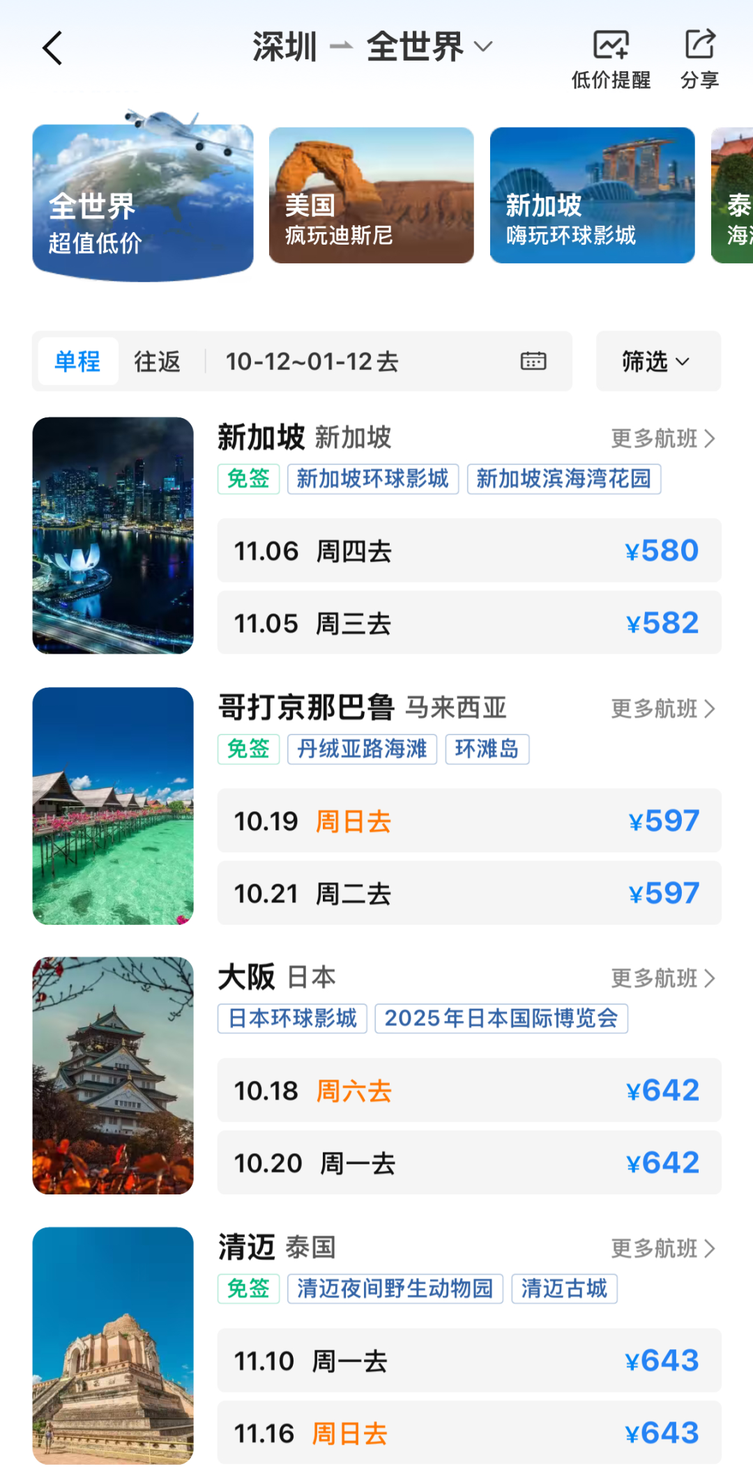 除了国内航线,深圳出境游的机票价格也出现了不同程度的降价。深圳出发前往曼谷、吉隆坡、新加坡、槟城等热门旅游地区的最低票价都在500元上下。而深圳出发前往大阪、清迈等地的最低票价也仅在600元左右。