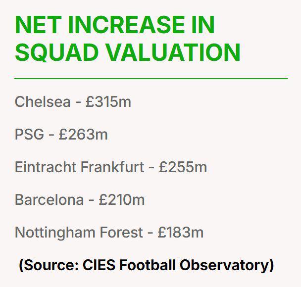 紧随切尔西之后的是巴黎圣日耳曼(2.63亿英镑)、法兰克福(2.55亿英镑)、巴塞罗那(2.1亿英镑)以及诺丁汉森林(1.83亿英镑)。这些俱乐部同样在转会市场上有着不俗的表现,但与切尔西相比,仍显逊色。