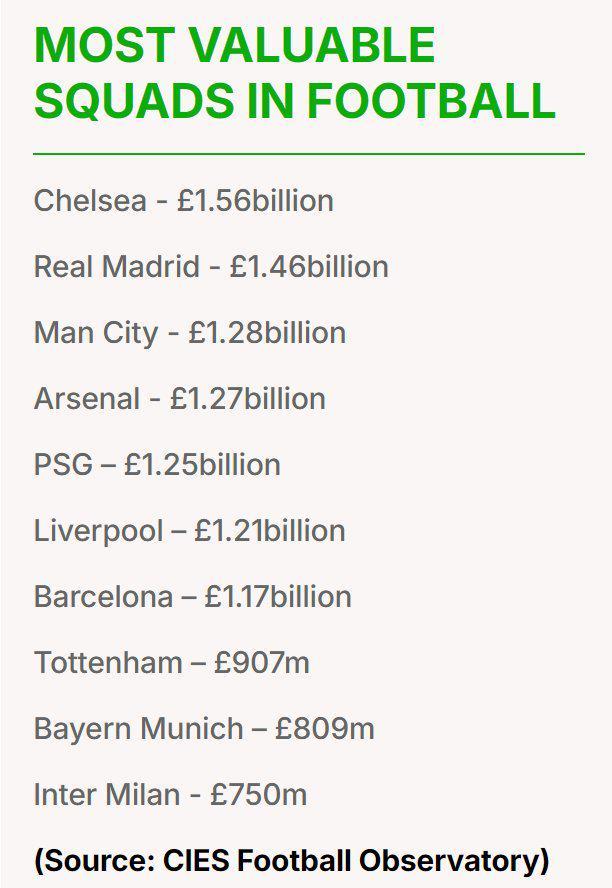 不仅如此,“足球天文台”还将切尔西的阵容身价列为全球之最,高达15.6亿英镑。这一数字甚至超过了皇家马德里(14.6亿英镑)和曼城(12.8亿英镑)等传统豪门,足以彰显切尔西在转会市场上的雄厚实力。