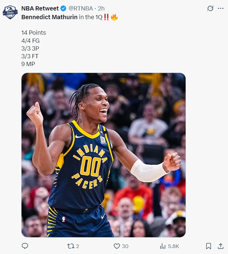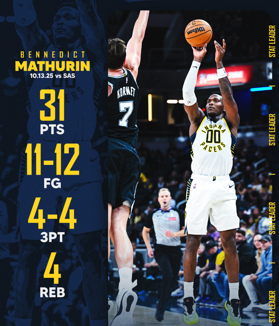 此役步行者派出新赛季常规先发阵容,马瑟林担任二号位。首节他仅出战9分钟便4投4中,其中三分球3中3,罚球3中3,以100%命中率砍下14分1篮板。面对马刺队瓦塞尔、巴恩斯等人的轮番防守,马瑟林用无解的投射能力证明了自己得分爆炸力。