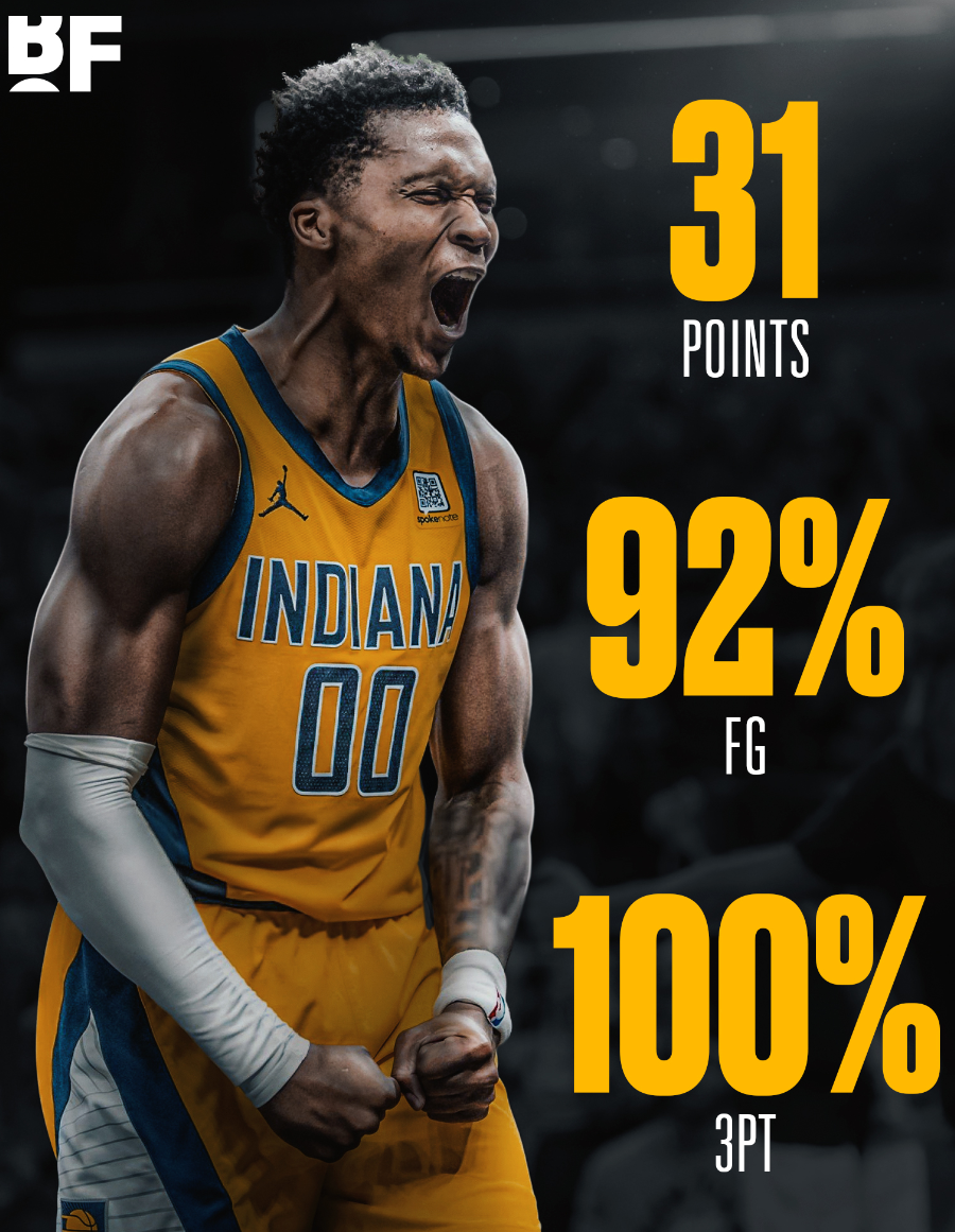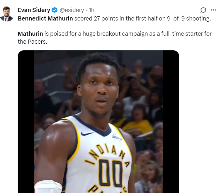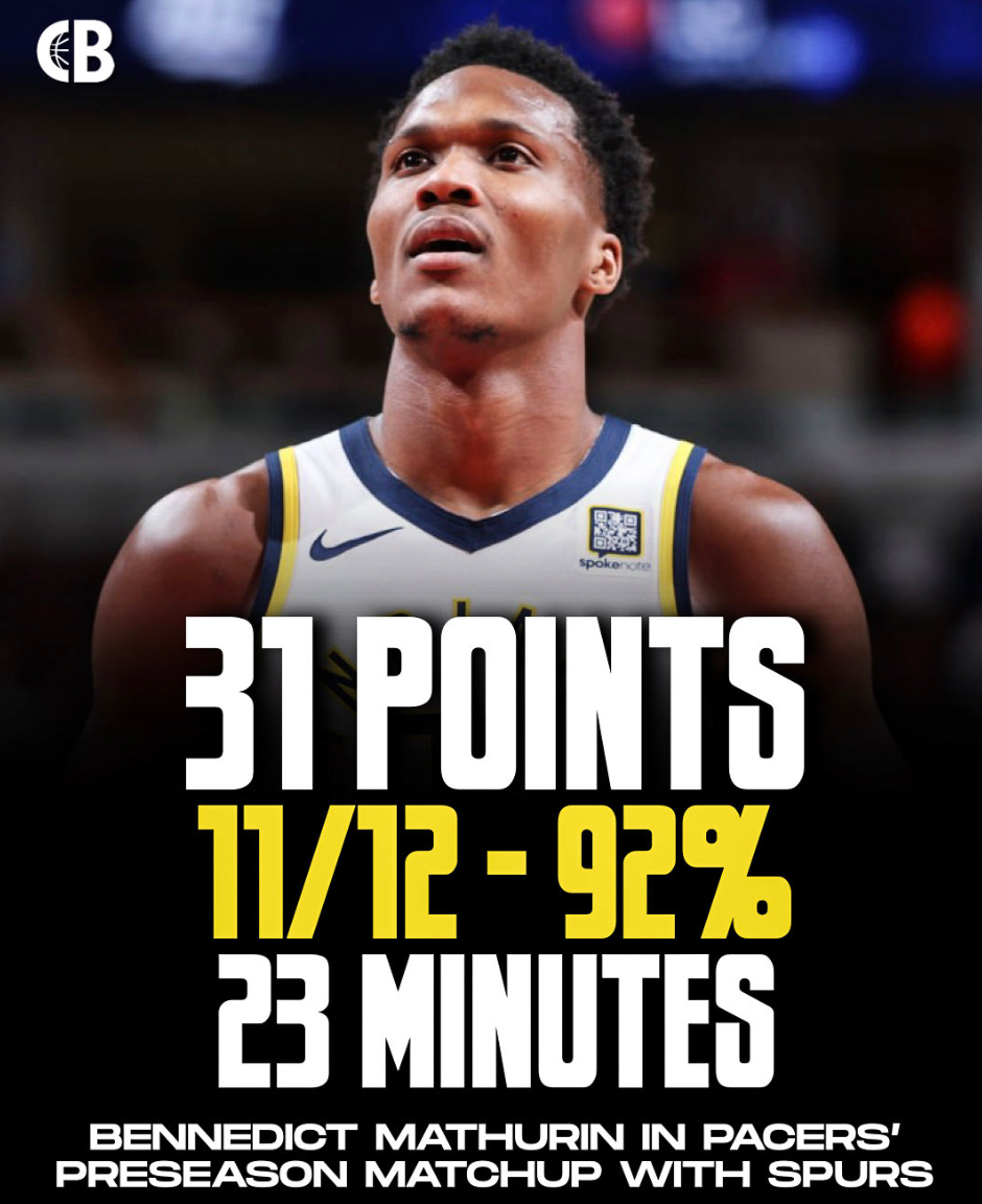 北京时间10月14日,NBA季前赛迎来一场焦点对决,步行者队以108-124不敌马刺队。尽管最终分差较大,但步行者新援马瑟林(Bennedict Mathurin)的炸裂表现却成为全美热议的焦点——全场23分钟12投11中,狂轰31分4篮板1助攻1抢断,半场9投9中命中率100%,真实命中率高达120.5%,堪称季前赛最耀眼个人秀。
