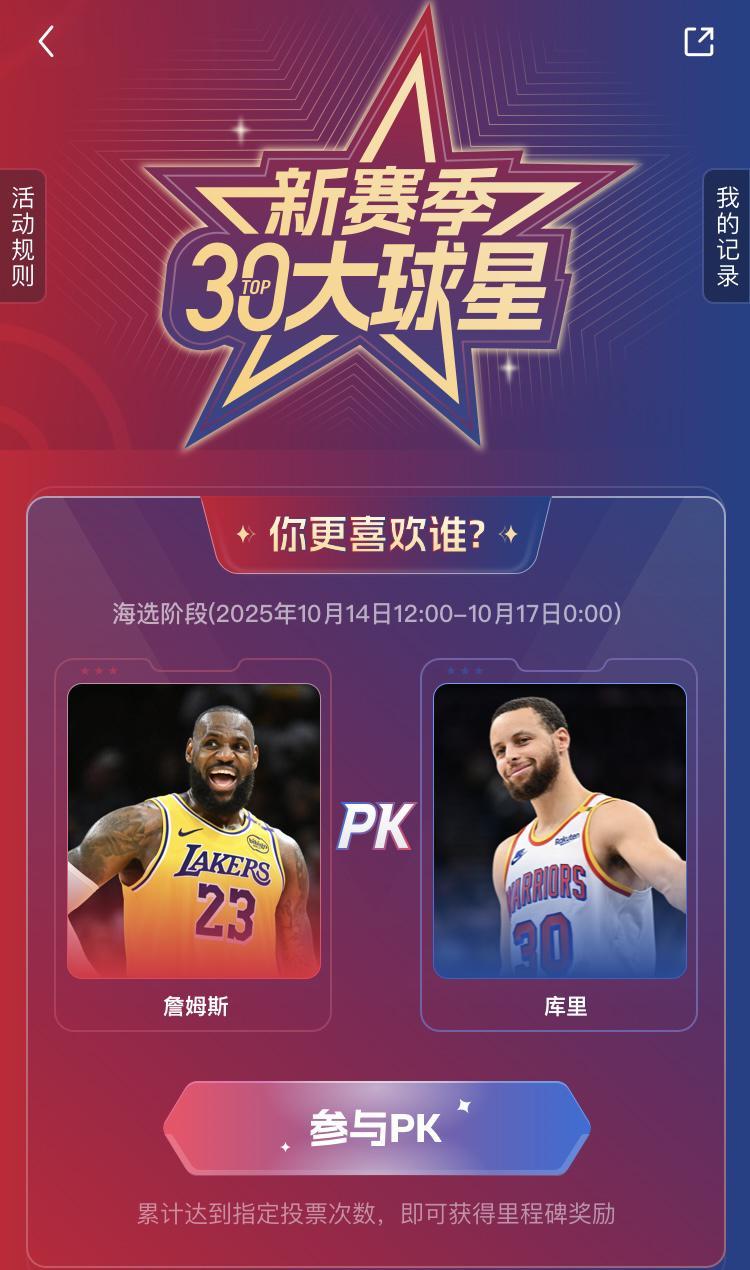 - 30强排名阶段,每位用户可在活动页面中按照第一选票(5分)、第二选票(3分)、第三选票(1分)来选择自己心目中新赛季最喜爱的球星前三顺位,并生成投票结果。