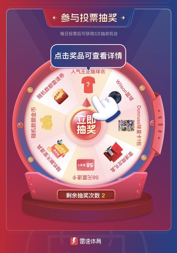 参与活动的过程中,球迷们不仅有机会表达自己的喜好,更有丰厚奖品等你来拿。每进行一次PK,即可获得抽取转盘的机会,赢取随机聊天室道具、随机数额雷速券或金币等惊喜好礼。当PK次数达到一定里程碑时,更有专属设计的限定款挂件相送,如“萌神出击”挂件和“王之凝视”挂件,有效期长达365天。而最令人激动的,莫过于有机会抽取NBA正品球衣一件,让你与心中的球星更近一步!