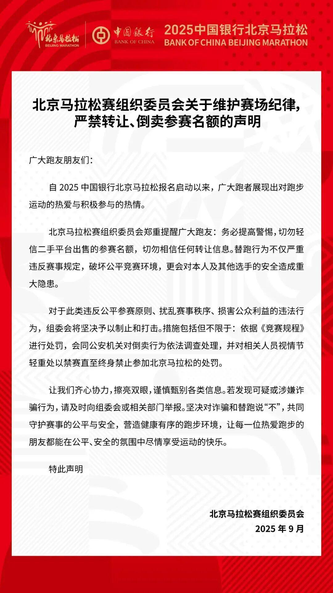 近日,北京马拉松赛组织委员会通过“北京马拉松”微信公众号发布了一则重要声明,旨在维护赛场纪律,坚决禁止参赛名额的转让与倒卖行为。