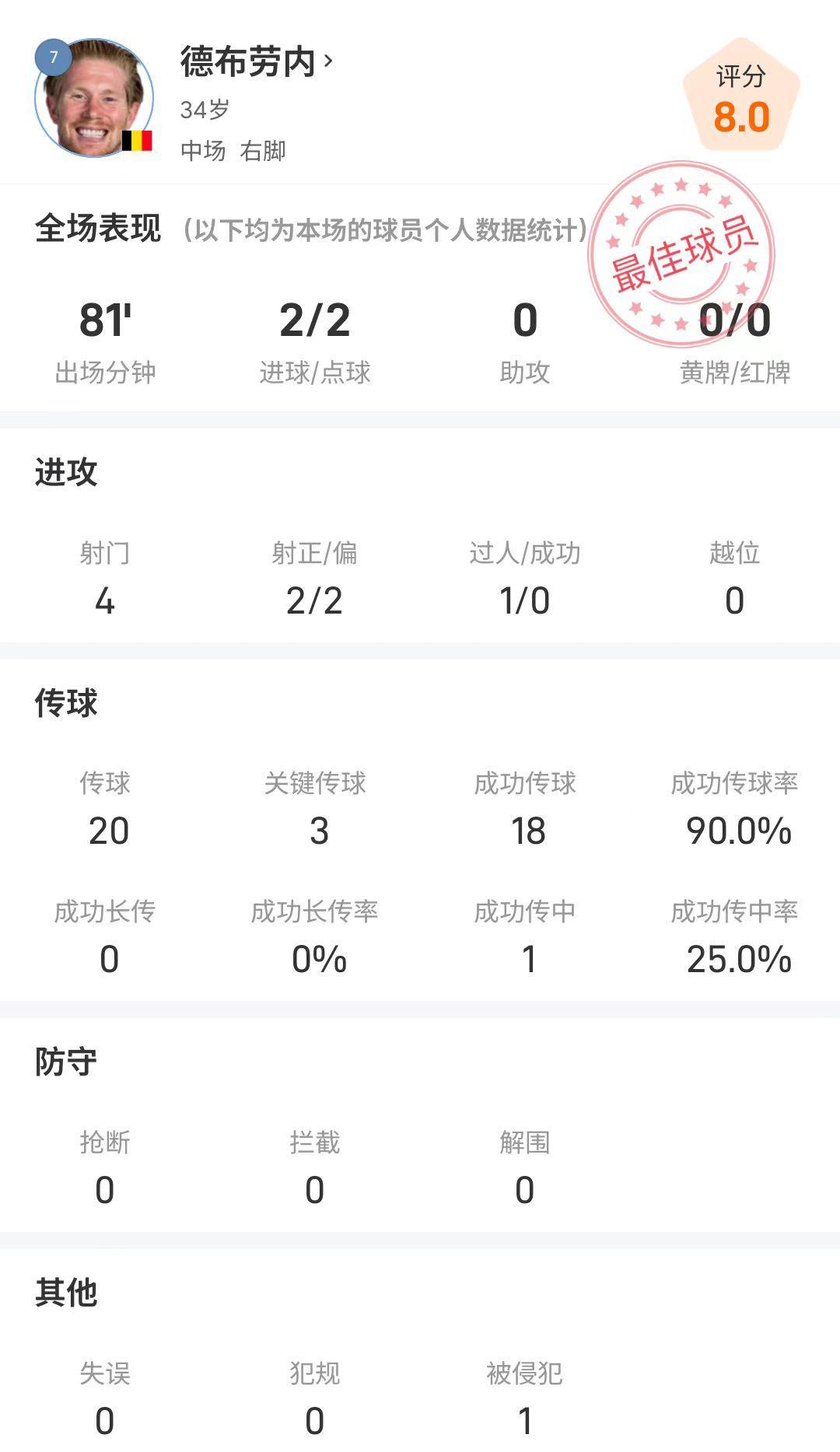 综合评分:凭借出色的表现,德布劳内获得了8.0的高分。