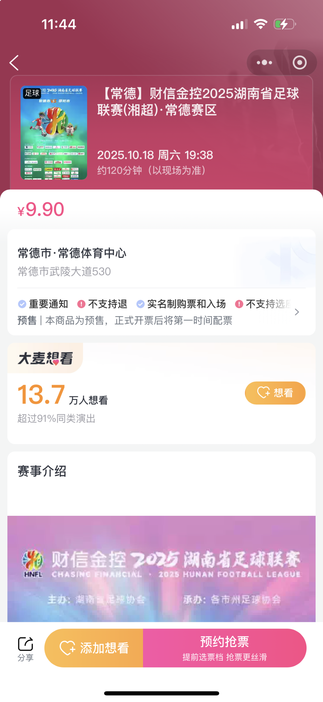 目前,本场比赛的门票预约通道已在大麦网正式开启。球迷们只需登录大麦网小程序或APP,搜索“湘超(常德)”,即可轻松预约购票。据统计,已有超过13.7万名球迷表达了观赛意愿,门票抢购热度空前!
