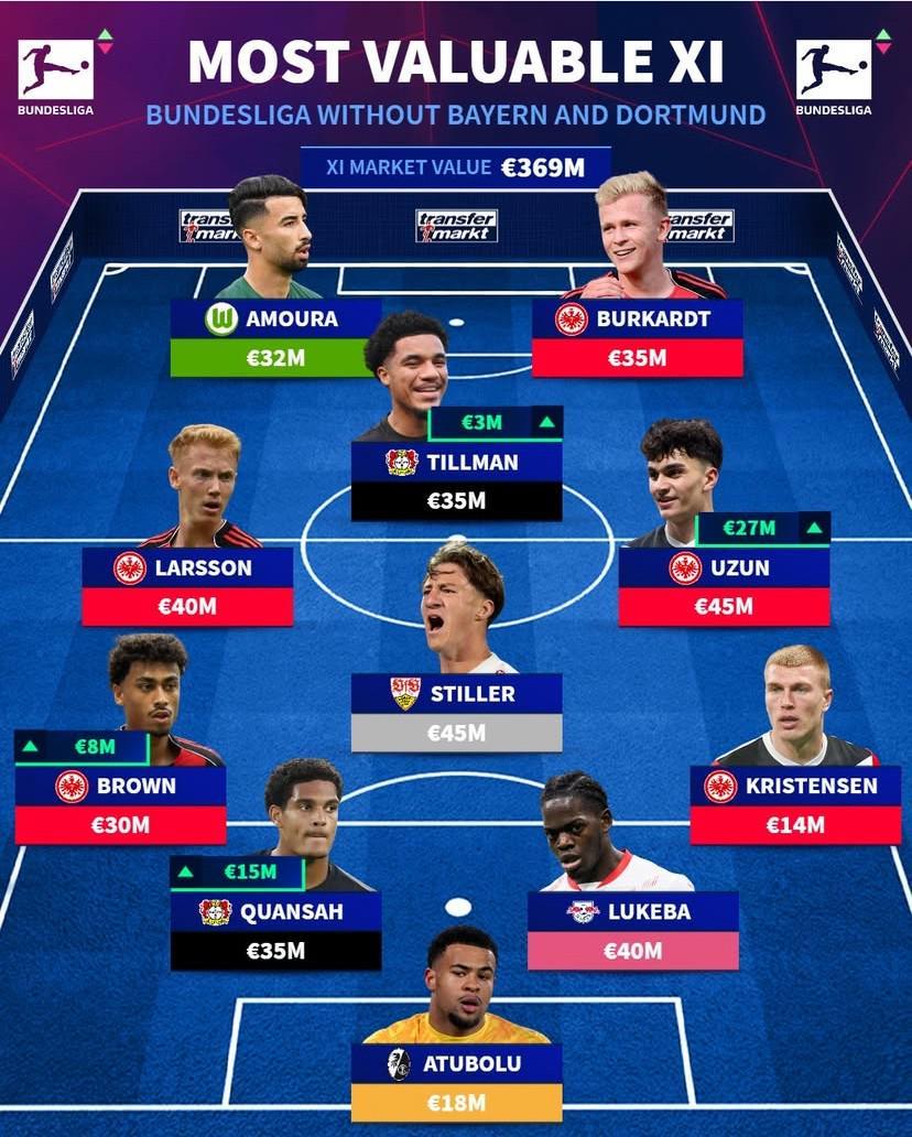 不含拜仁和多特球员的德甲最贵阵容如下: