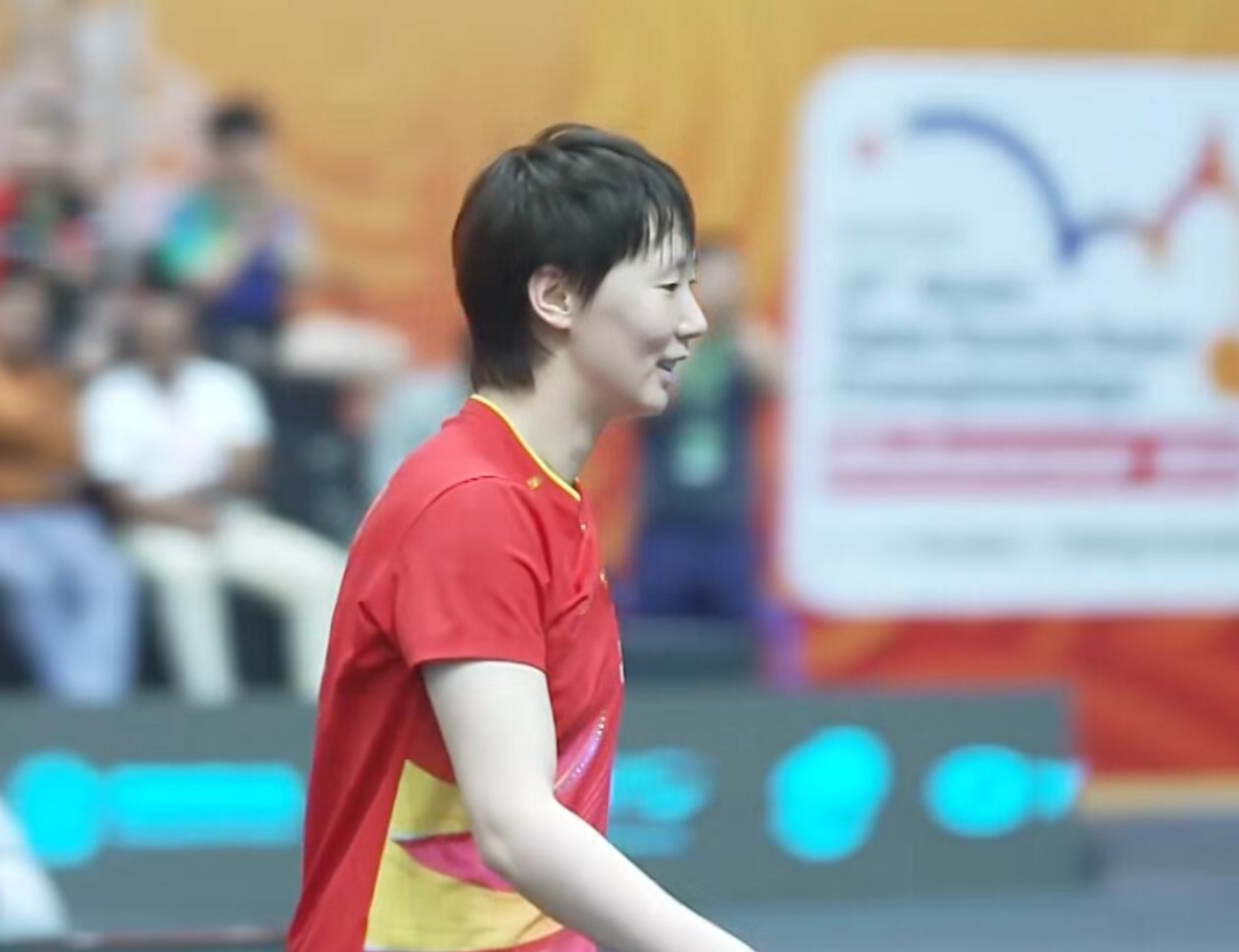 第二盘比赛,王曼昱对阵韩国选手金娜英。首局比赛,王曼昱失误较多,导致输掉一局。但她在第二局中迅速调整状态,主动发动进攻,成功扳回一城。第三局,王曼昱开局大比分领先,虽然局中有些着急,但经过暂停调整后,她依然稳住了阵脚,拿下关键一局。第四局,王曼昱完全掌控了比赛节奏,全局压制对手,最终以3-1的总比分逆转获胜,四局比分分别是11-8,5-11,7-11,6-11。