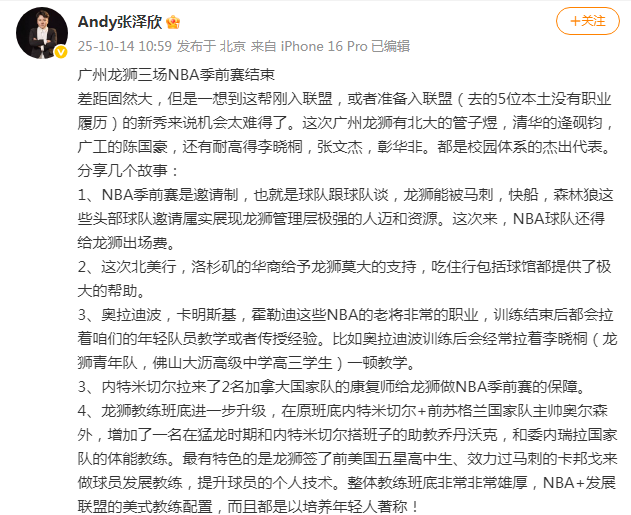 北京时间10月14日,广州男篮结束了今年的NBA季前赛征程。尽管在3场季前赛中合计输掉了138分,被外界戏称为“交学费”,但广州男篮官方表示,这次北美之行让他们清晰地看到了与顶级联赛的差距,并坚称“学费从不白交”。据媒体人张泽欣报道,广州男篮此次参赛是受马刺、快船与森林狼等强队的邀请,且还需支付出场费,这无疑展现了广州男篮管理层的强大资源与人脉。