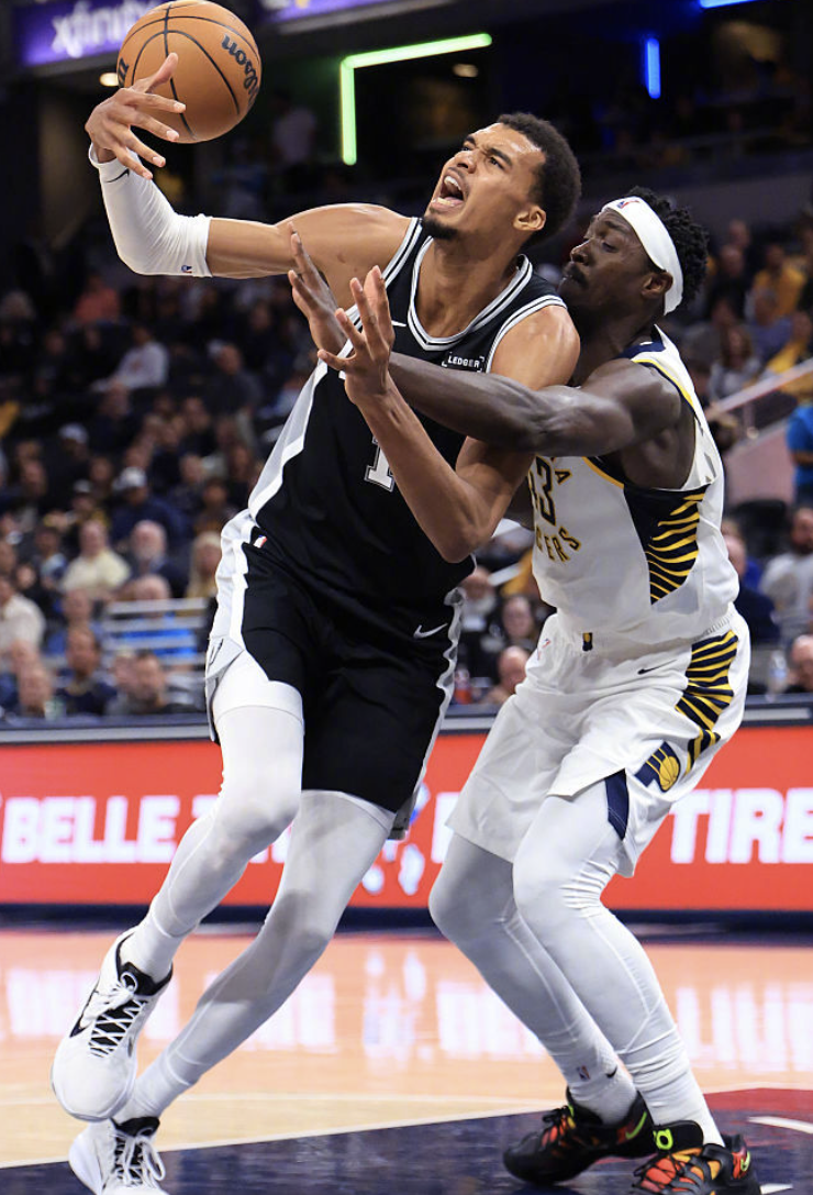 面对步行者的比赛中,文班亚马仅用24分钟便轰下27分11篮板,得分效率远超上场时间。这位身高2米26的内线巨兽,不仅能在篮下飞天遁地,更具备运球突破、中远投等全能技术,让人想起姚明巅峰时期的内线统治力。而其运动战13中15、65%的命中率,以及直接撞飞对手完成暴扣的场景,又与字母哥的冲击力如出一辙。