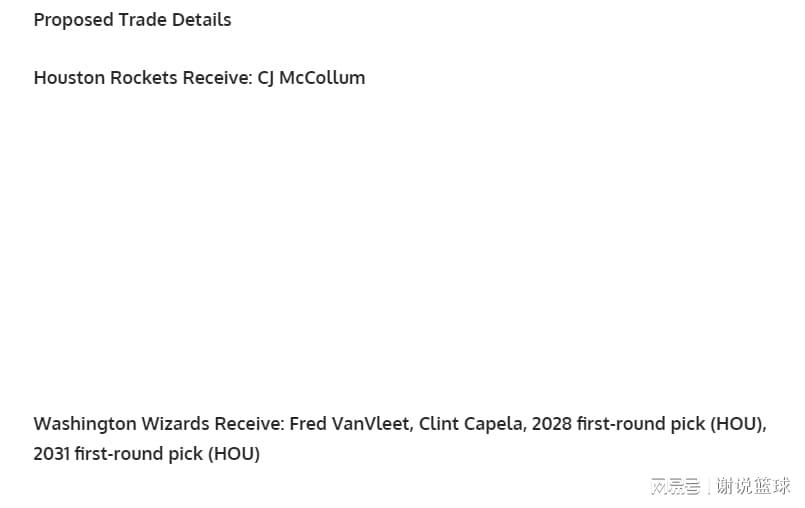 面对如此困境,火箭若想冲击总冠军,升级后场实力势在必行。媒体FW也持相同观点,并支招火箭:可以从奇才队交易来双能卫CJ·麦科勒姆。除了范弗利特外,今年夏天刚回归火箭的中锋卡佩拉,或许将再次成为交易筹码。此外,火箭还需送出两个首轮选秀权,以完成这笔交易。