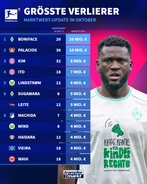 雷速体育10月14日讯 近日,德国转会市场(Transfermarkt)发布了最新一期德甲球员身价更新数据,并同步公布了德甲球员身价跌幅排行榜。其中,目前租借至不莱梅的药厂中锋博尼法斯以2000万欧元的跌幅位居榜首,成为本轮身价暴跌的“最大输家”。